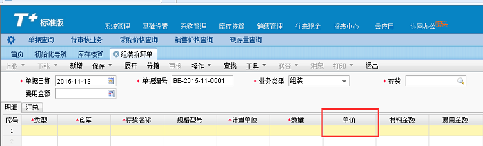 T+标准版库存管理组装拆卸单可以不填单价吗,怎么设置才能不填单价,或者是单价填0
