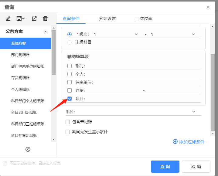 在查询条件中只勾上项目,分组设置中勾上科目进行查询。