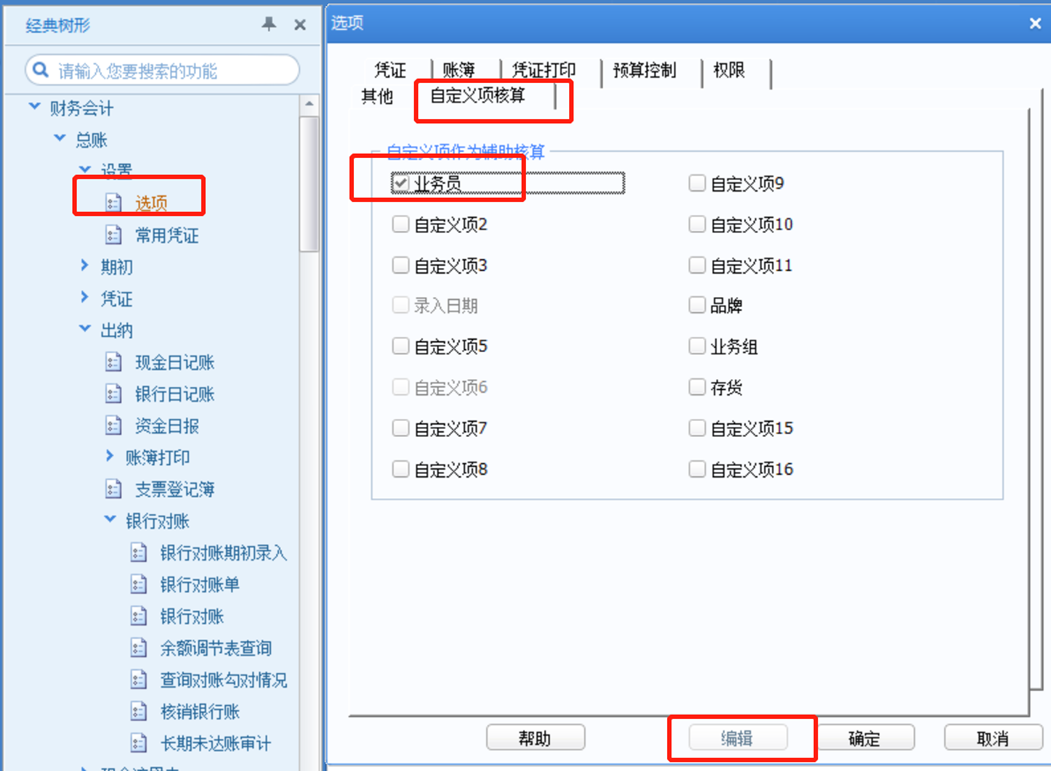 3) 在总账-设置-选项-自定义核算页签,点击编辑勾选自定义项;