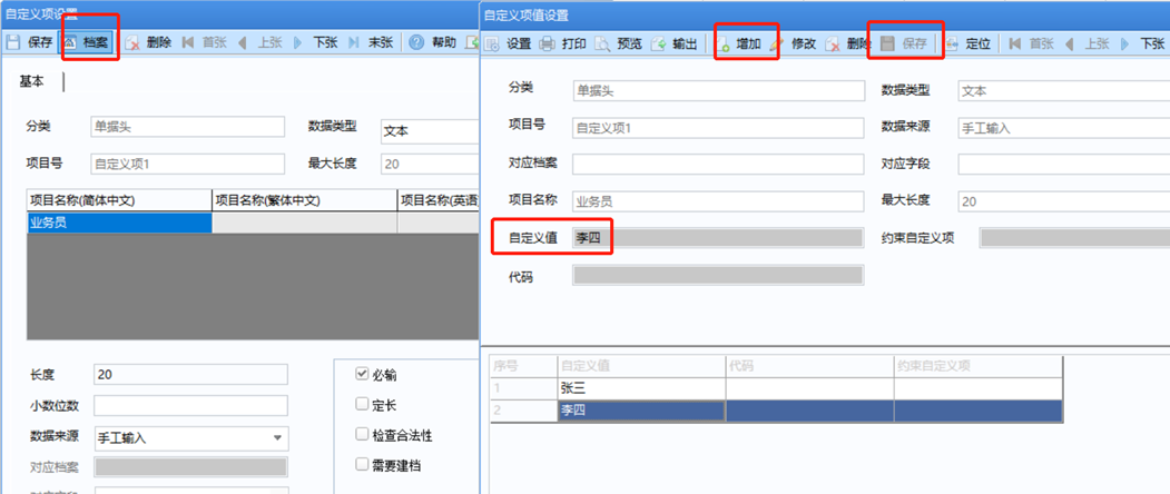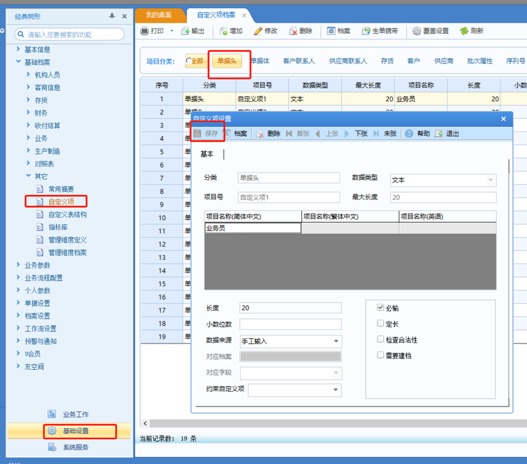1) 在基础档案-基础设置-其他-自定义项-单据头中双击自定义1,设置项目名称为业务员。维护好长度和数据来源,点击保存。