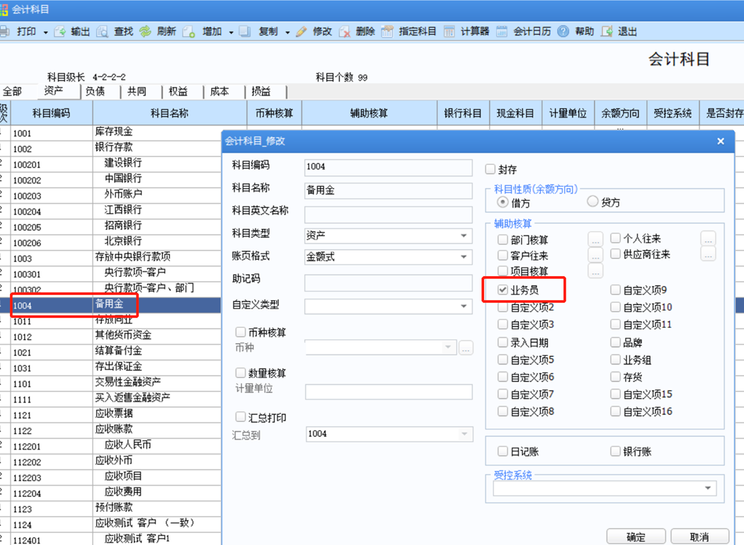2) 会计科目中进入科目明细界面,勾选该自定义辅助核算;