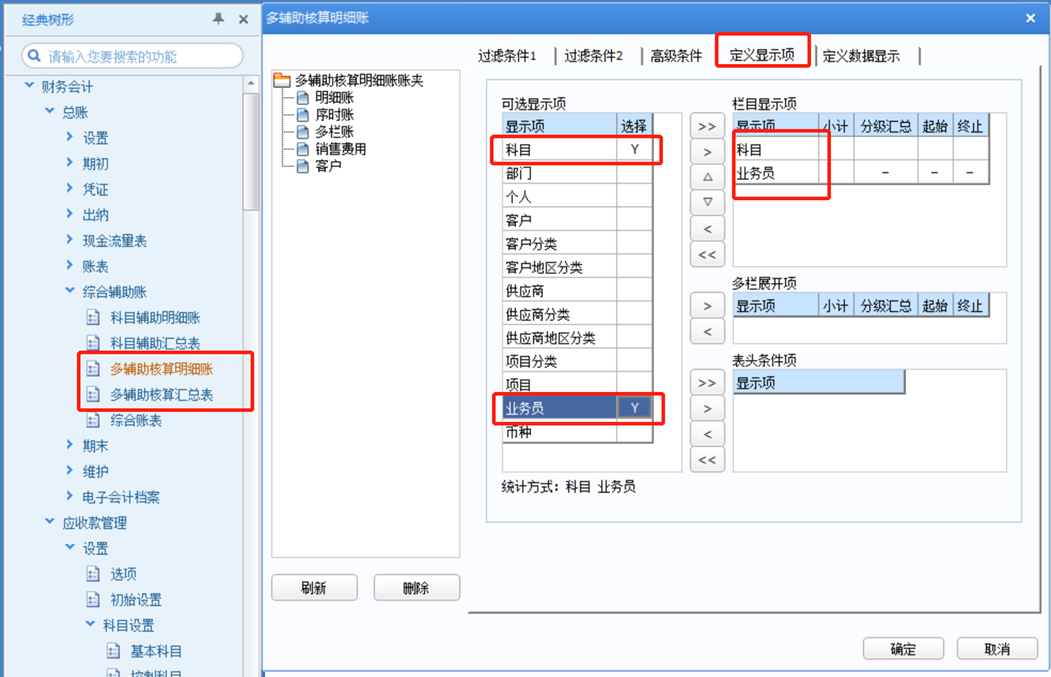 5) 查询多辅助明细账/多辅助核算汇总表,条件定义显示项页签选择科目+自定义项。