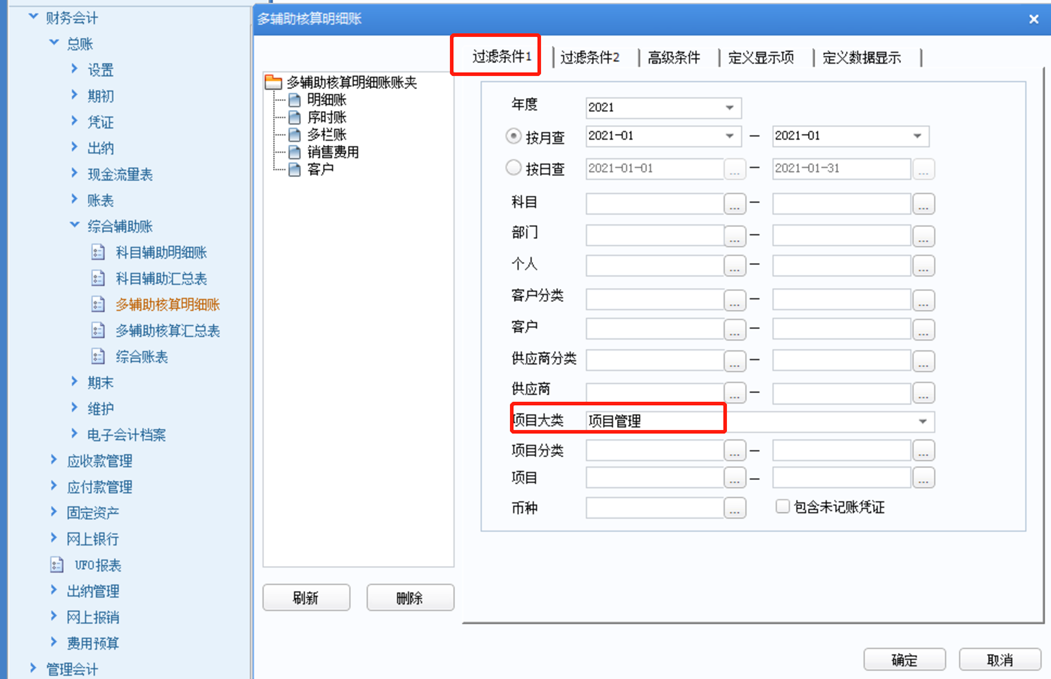 注意:如果科目同时勾选了项目和自定义项辅助核算,定义显示项需勾选科目+自定义项+项目,同时在过滤条件1中选择科目所在项目大类。