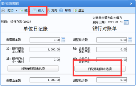 【注】:其中日记账的期初可通过引入或者手工增行进行数据录入,其中【引入】可以把启用日期前的已记账银行凭证数据引入到此