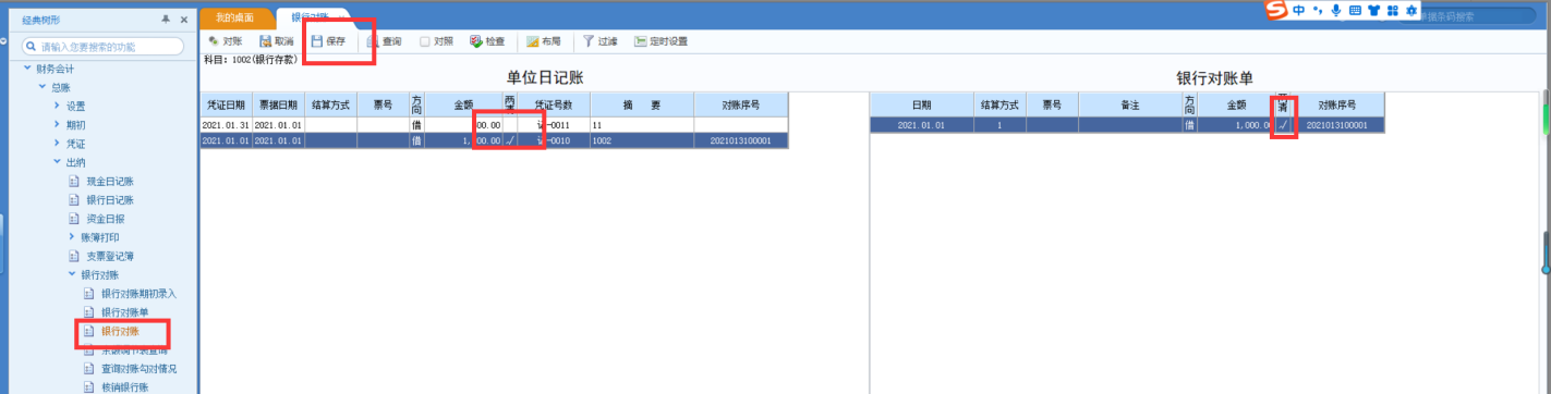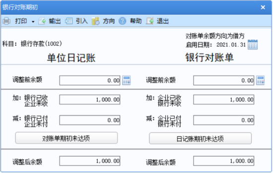 【注】:有一笔1000的在对账界面做了两清的操作,因此余额调节表不显示,余额调节表显示的是实际可用的存款数额