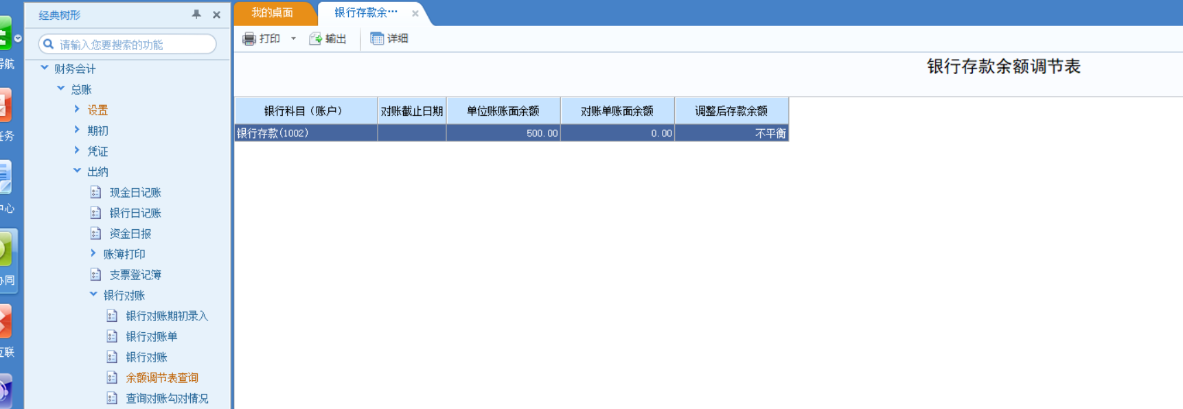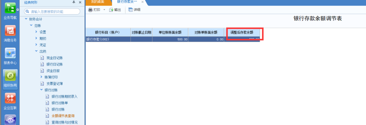 3、进行银行对账后查看余额调节表