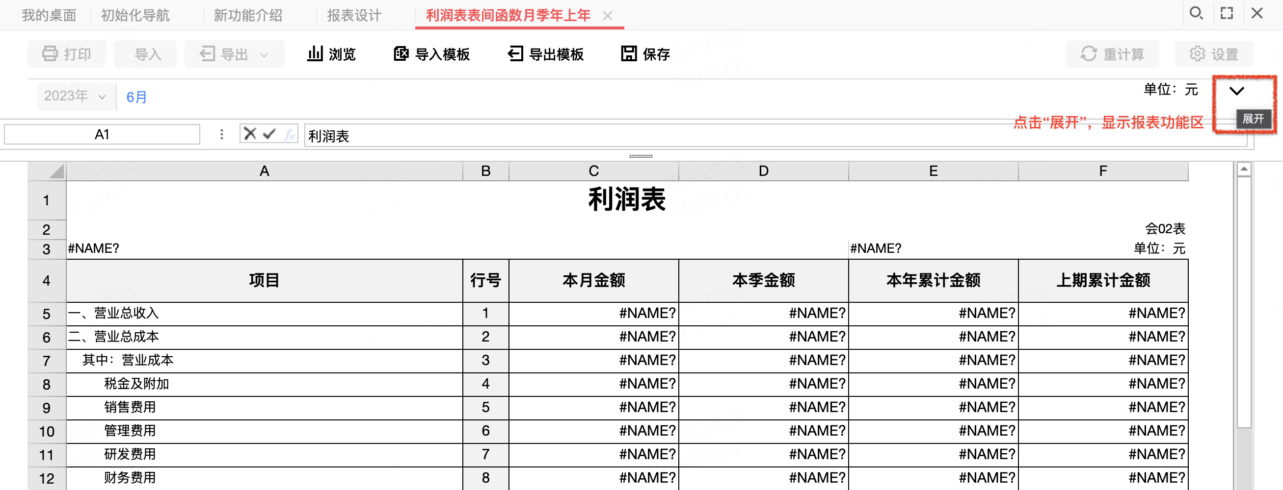 • 在模版编辑状态,点击右上方展开、收缩按钮,显示、隐藏报表功能区。