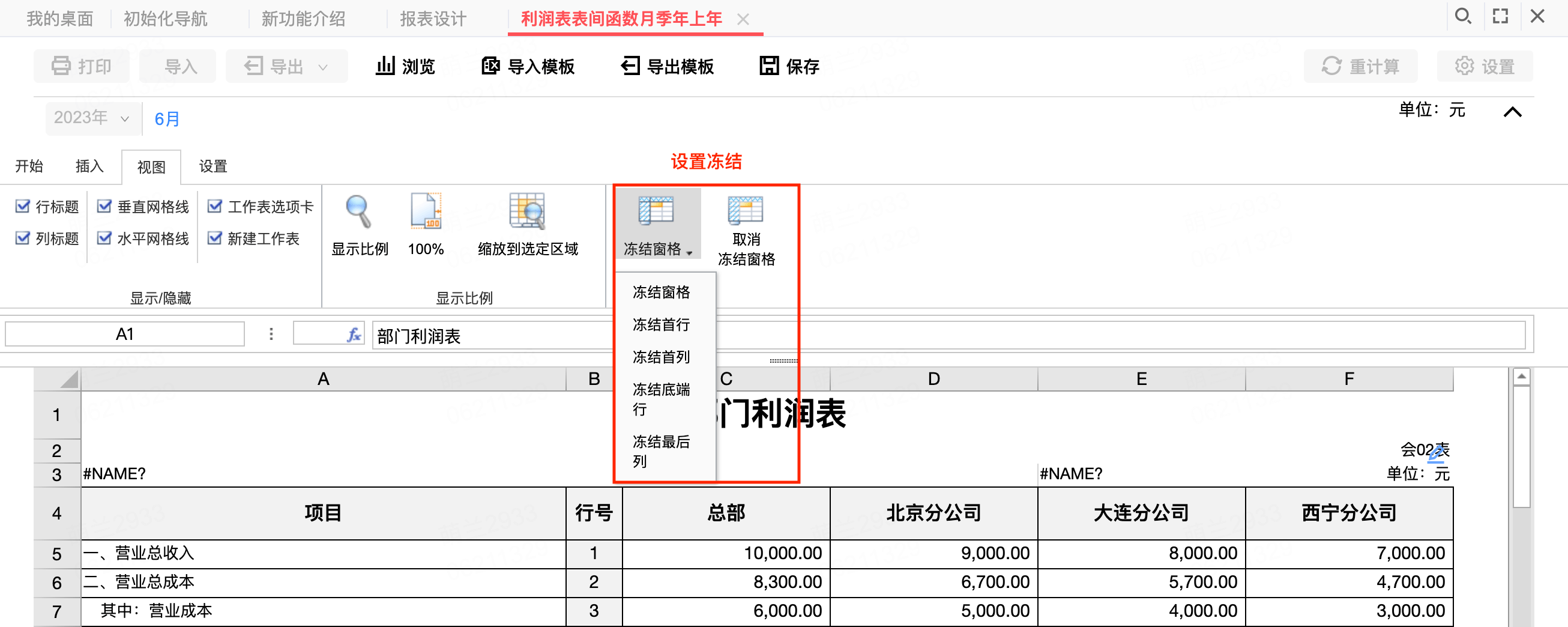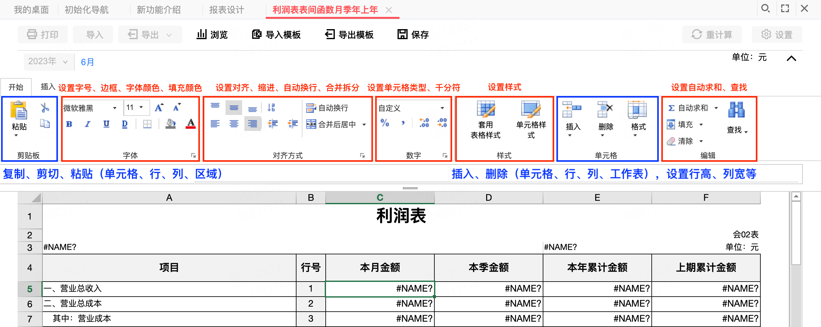 • 在新TUFO中,直接设计、修改报表模版,比如,设置字体字号对齐方式、单元格合并拆分、设置单元格格式、增加插入删除行列、复制剪切粘贴、锁定窗格、设置千分符等。