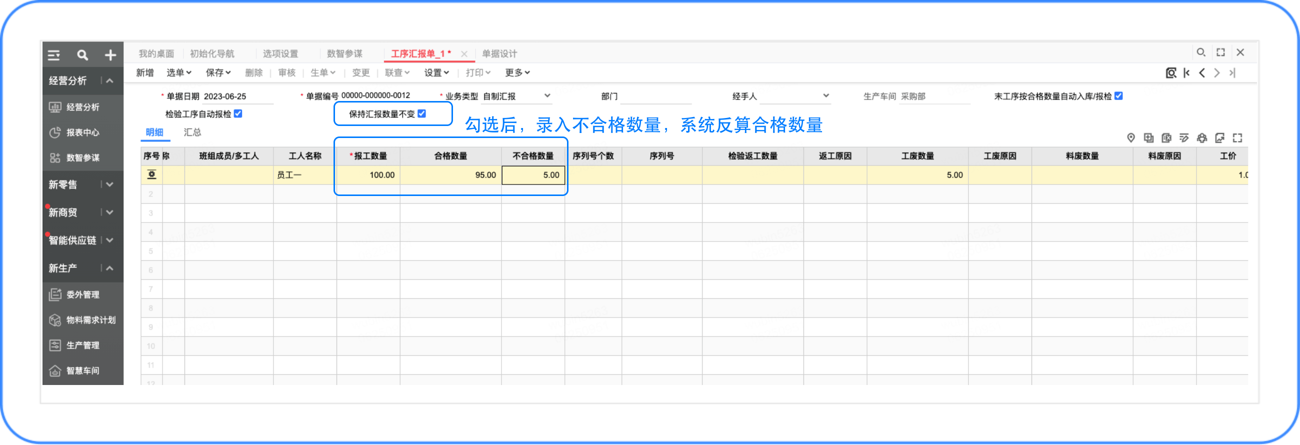 工序汇报单支持合格数量和不合格数量互相反算