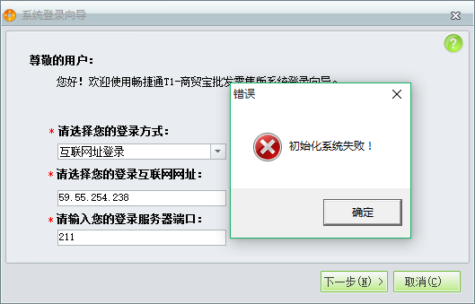 T1软件客户端连接服务器版本标准版12.6提示:初始化系统服务器IPping通telnet通,服务器正常登陆,请问如何处理?