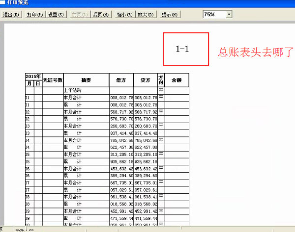 进入总账-设置-选项-账簿,将打印位数宽度的6个数字都调大,打印预览界面-设置-横向压缩第一页。