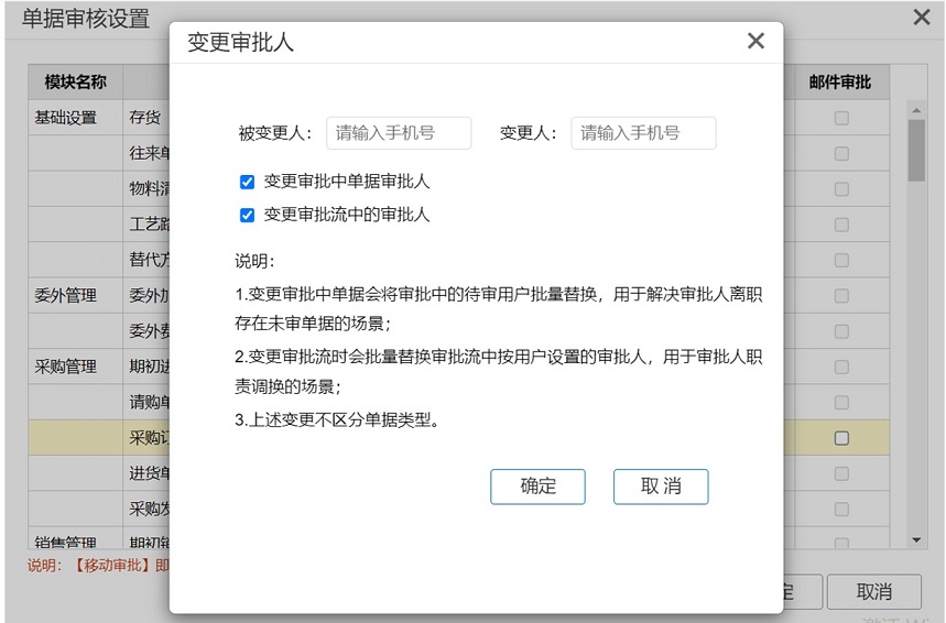 上述批量变更不区分单据,操作时会对所有设置了审批流的单据执行变更操作