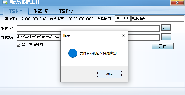 用户在使用T+账套维护工恢复账套时提示:“文件名不能包含相对路径”是什么原因?如何处理?