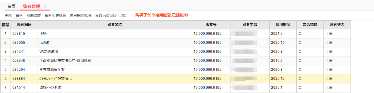 1、企业管理员登陆之后,在账套管理中进行数据备份。