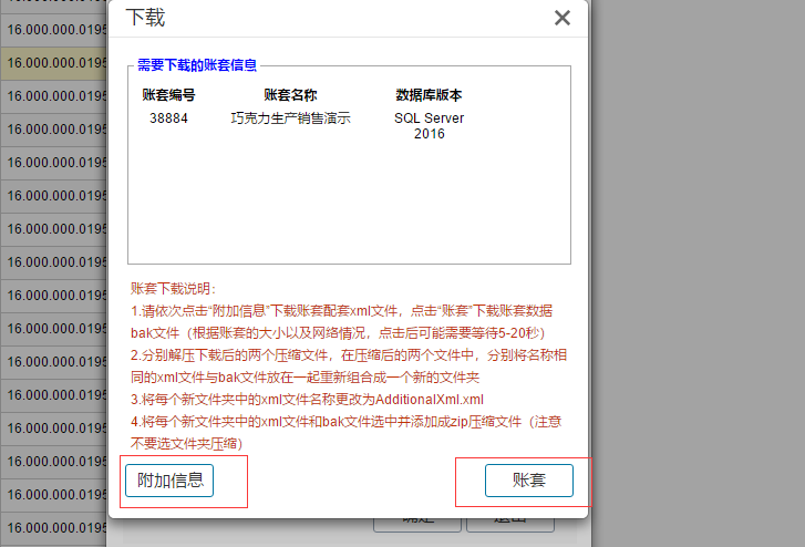 3、按照提示,下载数据文件和账套信息文件到本地,建议放在同一个文件夹中。