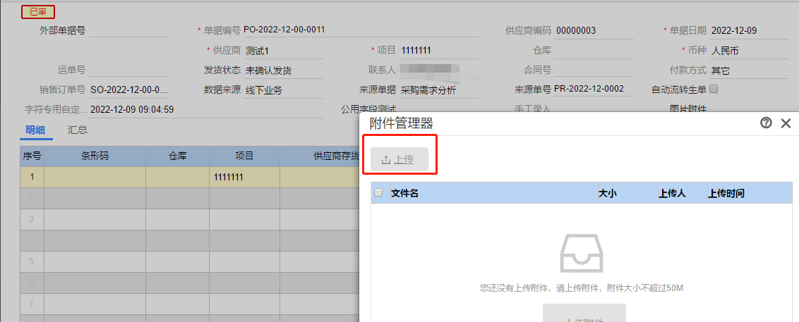 3、取消该勾选后,已审核的单据打开附件功能,上传按钮为灰色,无法上传附件