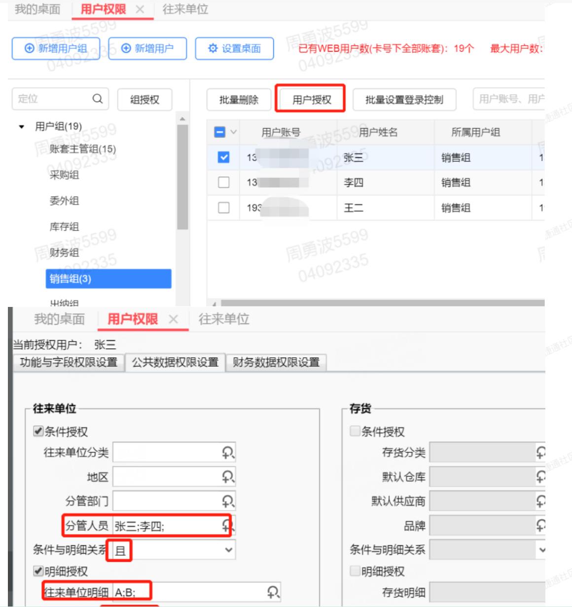 3.在【系统管理】-【用户权限】选择对应的业务员进行【用户授权】-【公共数据权限】把往来单位中的全部取消勾选,在往来单位【条件授权】中分管人员选择张三、李四,【明细授权】选择张三、李四分管的往来单位A、B;最后条件与明细关系选择【且】(这样一来就不能看到彼此分管的往来单位了);