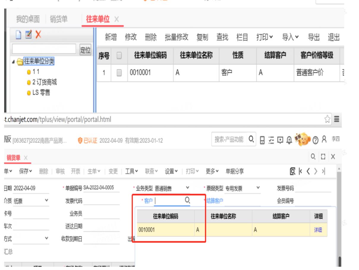 4.分别登入张三、李四两个用户,业务员李四去打开【基础设置】-【往来单位】档案只能看到客户A,做单据只能选到客户A;同理张三登入只能看到客户B,做单只能选到客户B.
