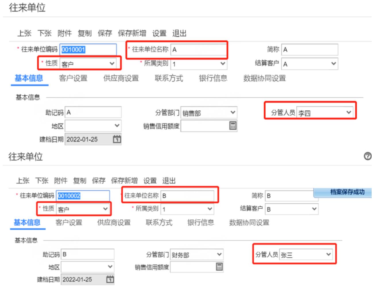 1.在【基础设置】-【往来单位】对客户A和B分别设置分管人员李四、张三;