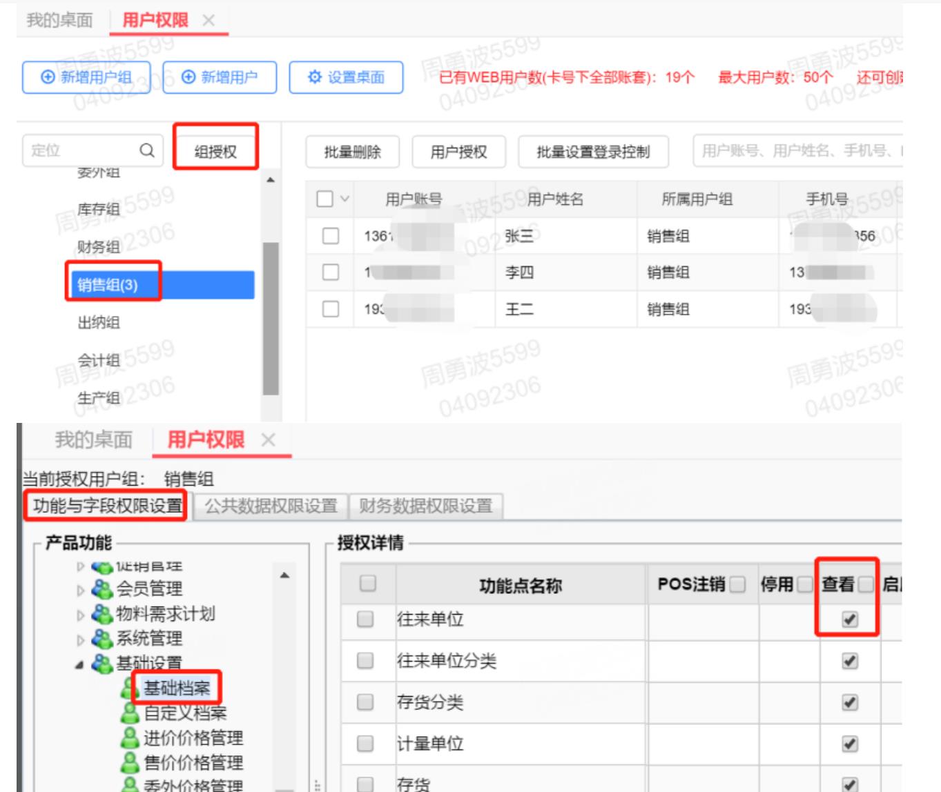 2.在【系统管理】-【用户权限】选择对应的组进行【组授权】-【功能字段权限设置】,以客户为例:对业务员工张三、李四授于查看、新增、修改、删除往来单位等权限(此时都能查看彼此分管的往来单位);