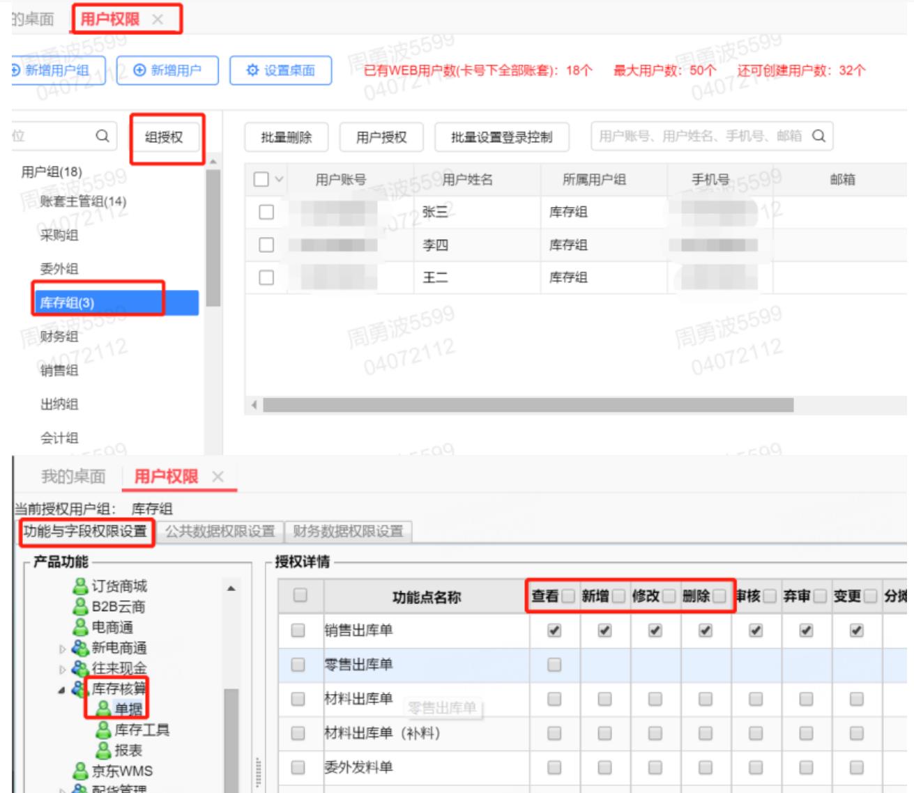 1. 在【系统管理】-【用户权限】选择对应的组进行【组授权】-【功能字段权限设置】,以销售出库单为例:对业务员工张三、李四、王二授于查看、新增、修改、删除等权限(此时都能查看、删除彼此做的单据);