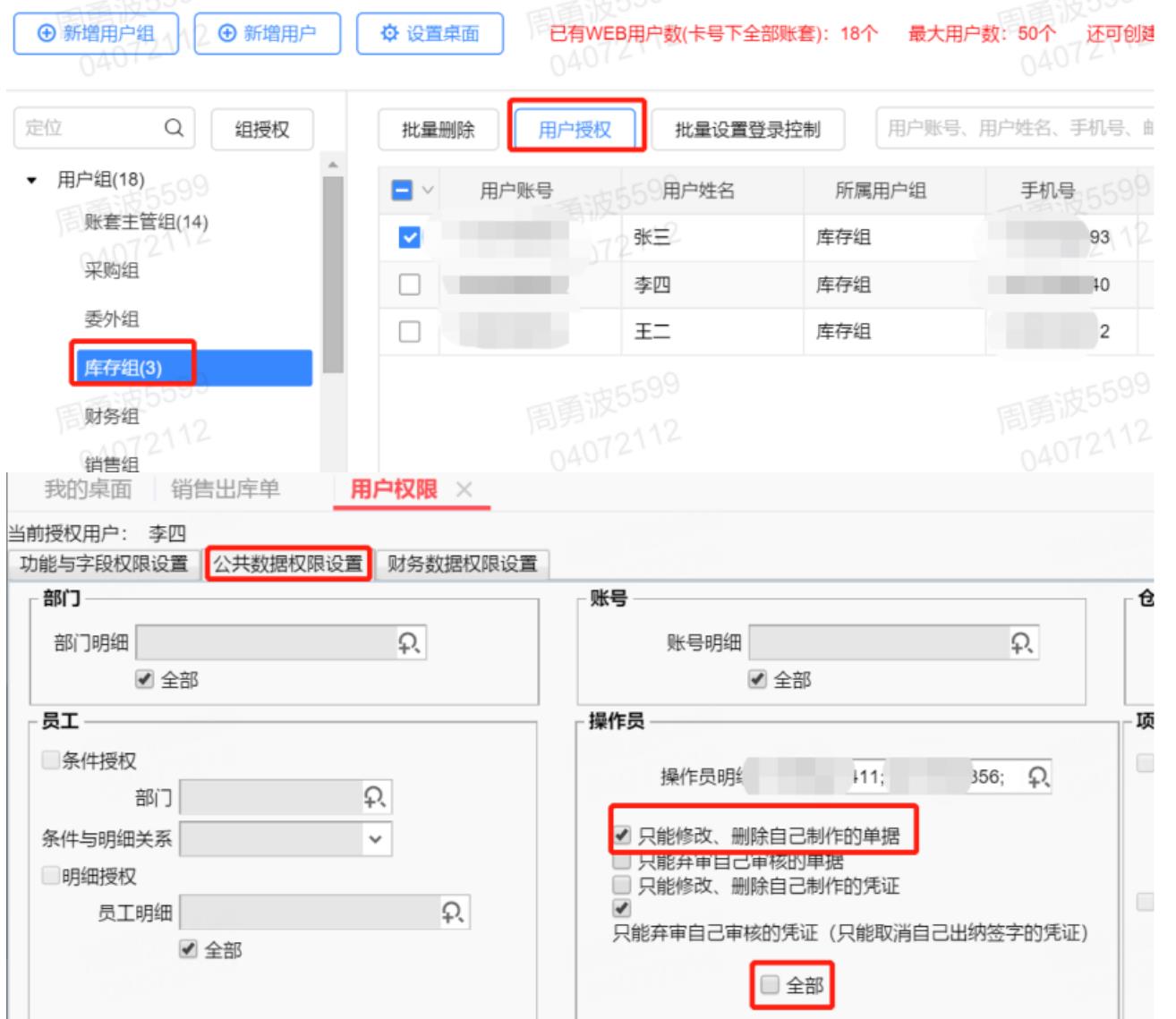 2. 在【系统管理】-【用户权限】选择对应的业务员进行【用户授权】-【公共数据权限】把操作员中的全部取消勾选,在操作员明细中张三、李四、王二3操作员,同时勾选【只能修改、删除自己制作的单据】(这样一来就可以看到彼此的单据,但是只能修改、删除自己制作的单据);