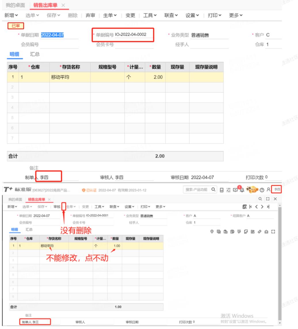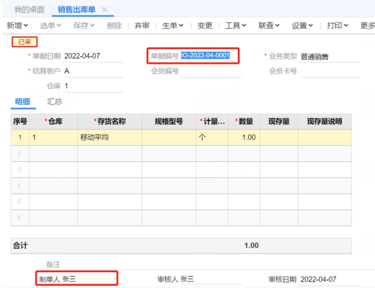 3. 分别登入张三、李四两个用户做单,操作员张三新增销售出库单IO-2022-04-0001,之后用操作员李四登入新增销售出库单IO-2022-04-0002,此时李四也只能查看和弃审张三制作的单据,不能修改,表头也没有删除字段。