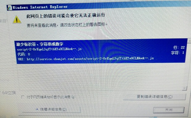 注册T+软件加密狗,网页左下角显示网页有错误,点击显示如图信息,请问如何处理?