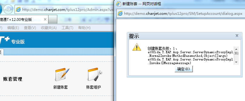 T+专业版演示账套网址,新建账套报错:创建账套失败?