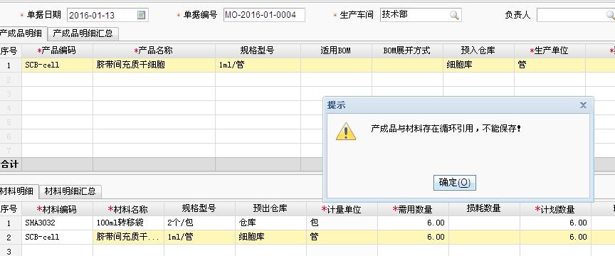 用友T+生产加工单制单提示:产成品与材料存在循环引用,不能保存?