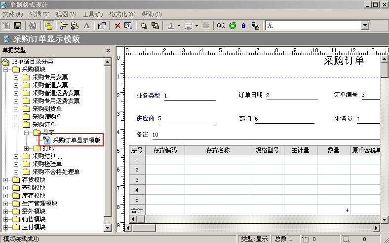 2、 在‘单据格式设计’中依次点开:‘采购模块’—‘采购订单’—‘显示’—‘采购订单模板’