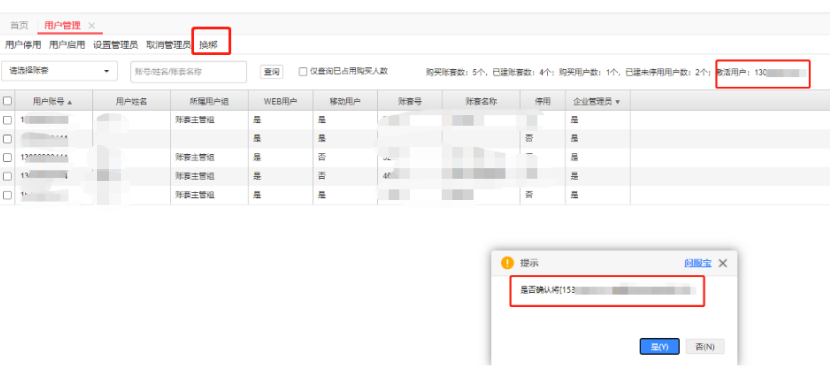 2.企业管理员登录,用130********登录,将150********设置为管理员,并点击换绑,更换激活手机号码为150********