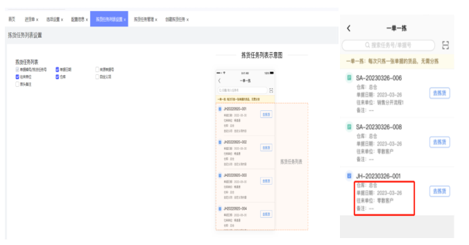 ①新增拣货任务列表设置,移动端根据勾选的字段,在拣货单据上显示。