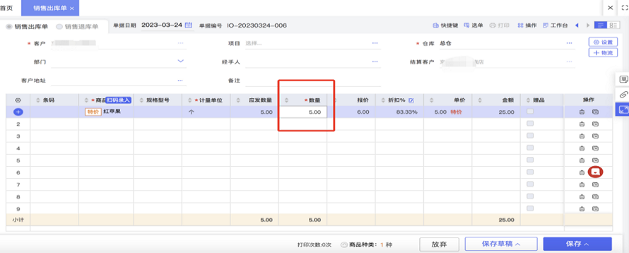 ②单品促销标识流转到销售出库单中,销售出库单中有促销的商品行仅能修改数量;且仅能改小