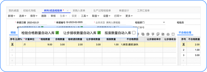 来料/成品检验单 - 表头增加【检验合格数量自动入库】、【让步接收数量自动入库】、【报废数量自动入库】选项,勾选的数量在生入库单时会自动带入,上述三个自动入库数量支持记忆功能。