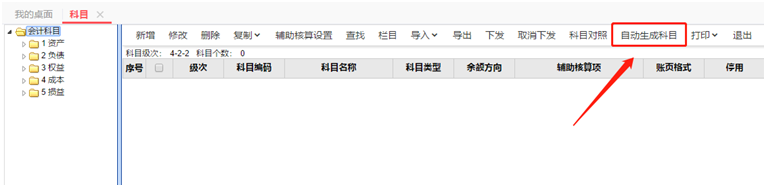 2、新增2023年度后,即可切换至软件登录界面,登录时间选择2023年1月1日,登录成功后,点击【基础设置】-【科目】-【自动生成下级科目】,此时将会参照2022年科目结构生成科目档案。