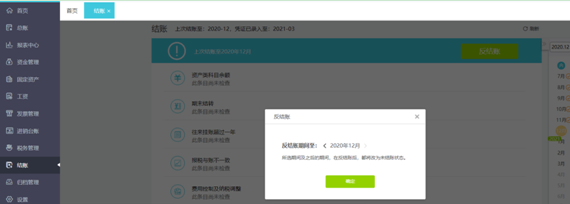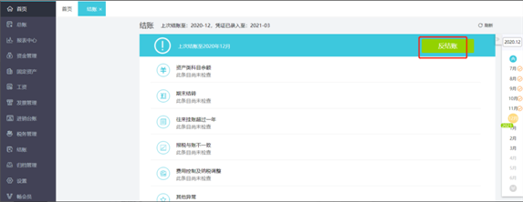 (1)点击【结账】-【结账】,选择需反结账的月份,点击【反结账】;