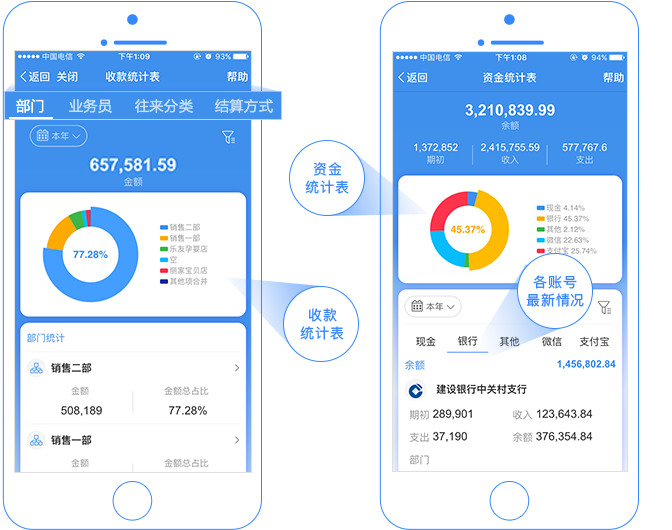 新增收、付款统计表,可按结算方式、往来单位、部门、业务员四个维度, 结合图表对收款情况进行展示,还可以联查对应的收款明细。