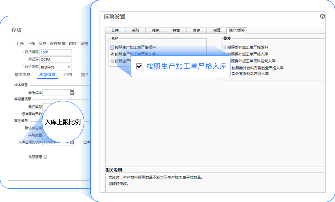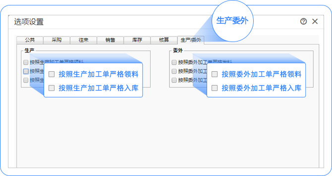 • 选项中,新增加生产/委外选项,拆分生产、委外出入库控制选项,生产、委外可分别控制。