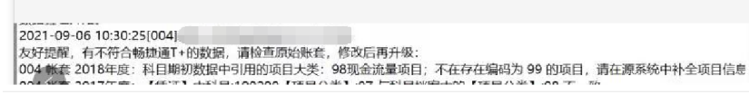T3升级T+,数据校验过程中报错:科目期初数据中引用的项目大类:98现金流量项目;不在存在编码为XX的项目,请在源系统中补全项目信息