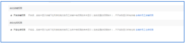 (3)开启维护店铺及仓库权限前应在【参数设置】设定中开启对应的权限,如下图