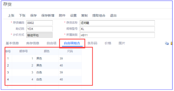 l 启用了自由项的存货,一个存货的自由项组合即一个电商商品,即一个存货下多个自由项组合,分别对应多个电商商品。所以启用了自由项的存货,需要维护该存货的自由项组合,若未维护自有项组合将不会被提取,如下图: