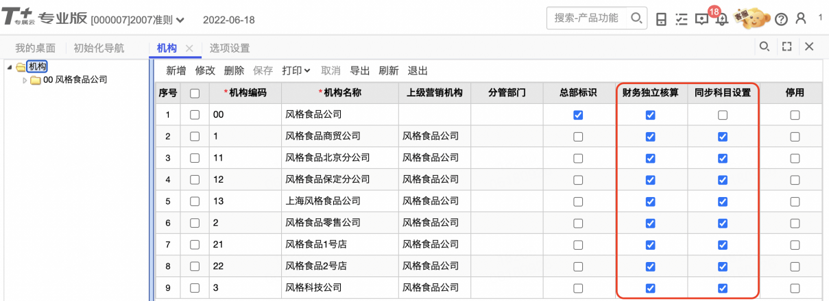 如果机构是独立会计主体,则勾选【财务独立核算】,比如:子公司、分公司,以及按独立会计主体进行考核的事务部、办事处、门店;