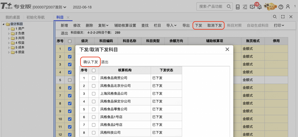 如果非总部机构的业务与总部类似(单据生凭证的入账科目相同),则勾选【同步科目设置】,总部向机构下发科目时,可以自动下发科目设置;