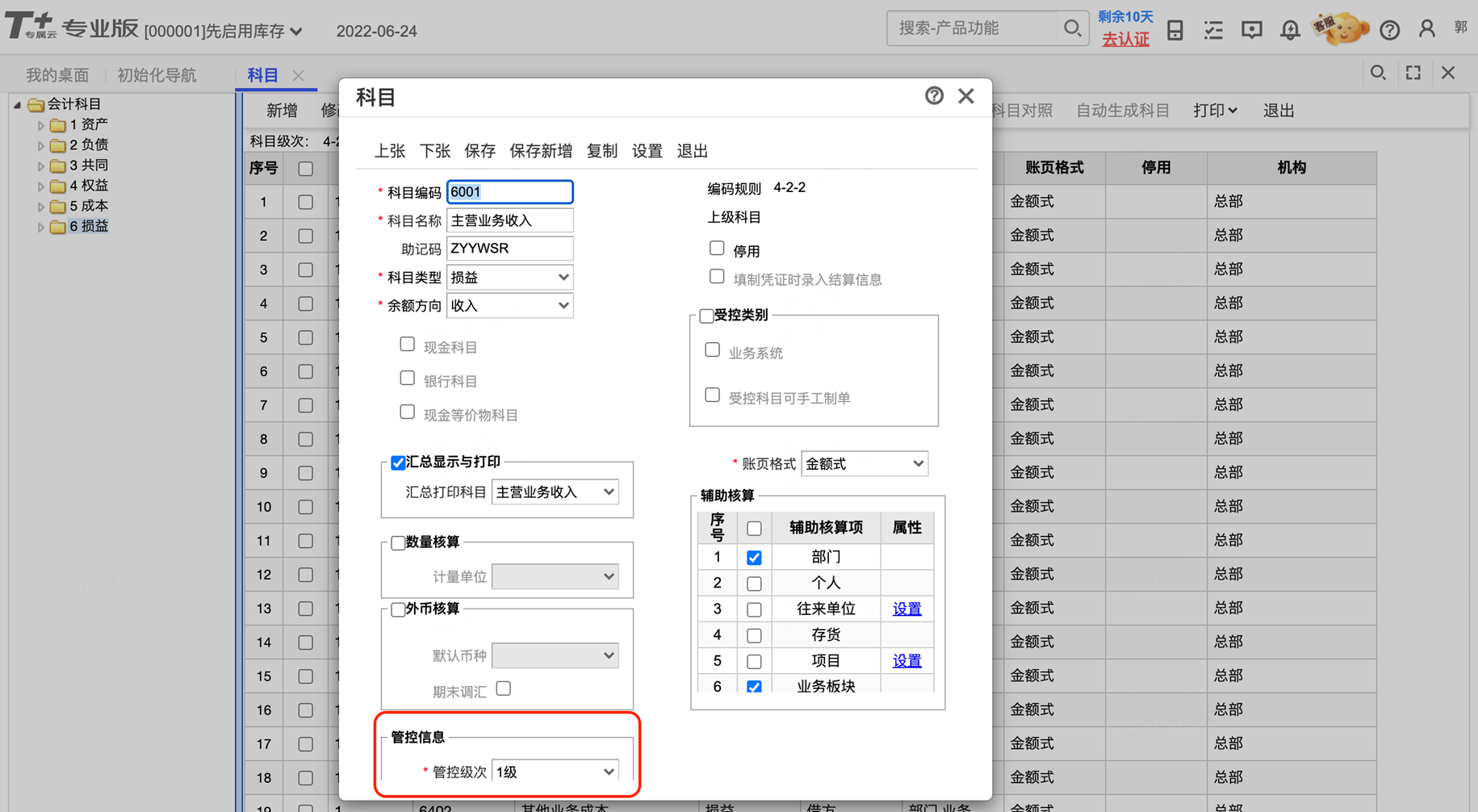 如果一级科目的管控级次为1,机构可在这个科目之下自建2级明细科目;
