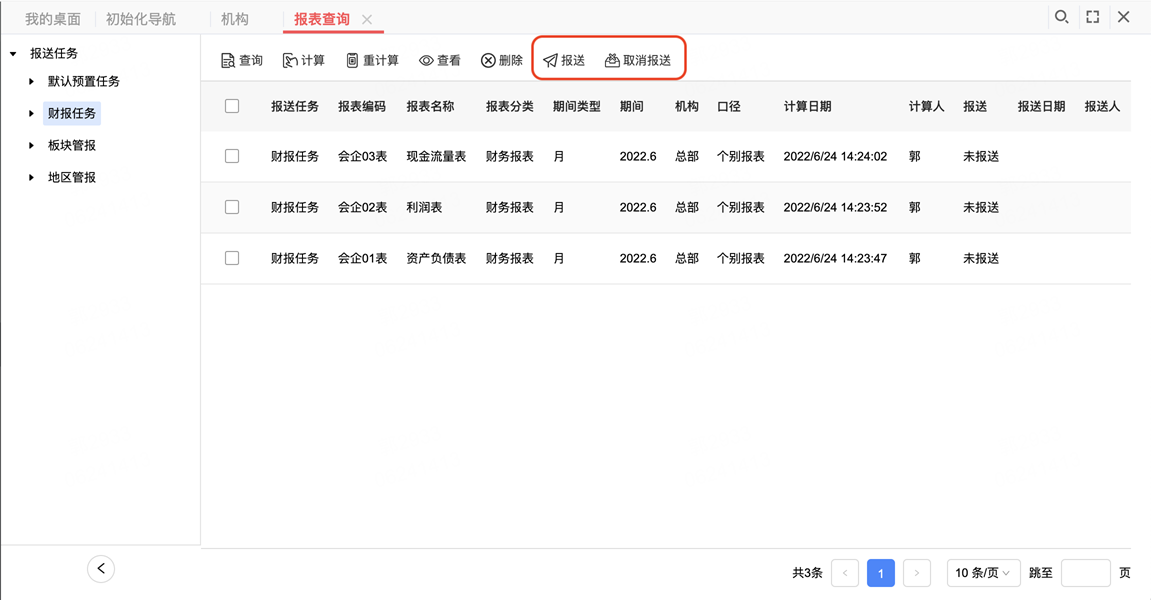 报送后的报表数据,不能修改、删除、重算,总部可以取消报送。