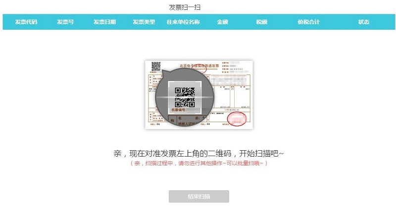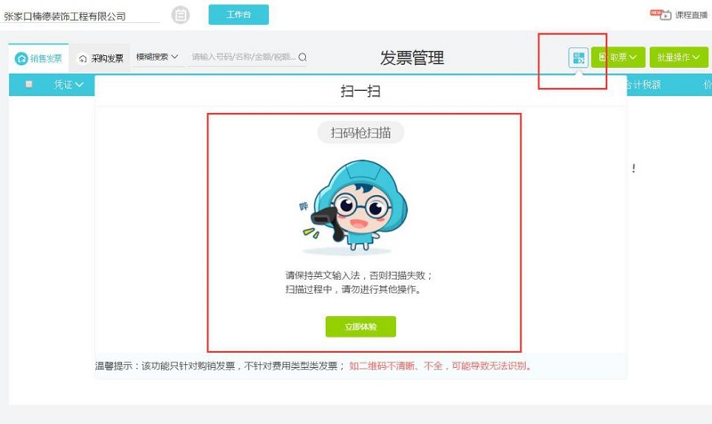 单击“发票扫一扫”按钮,出现“扫一扫”引导操作界面,单击“立即体验”按钮,即可进入扫描枪批量录入发票信息的界面。