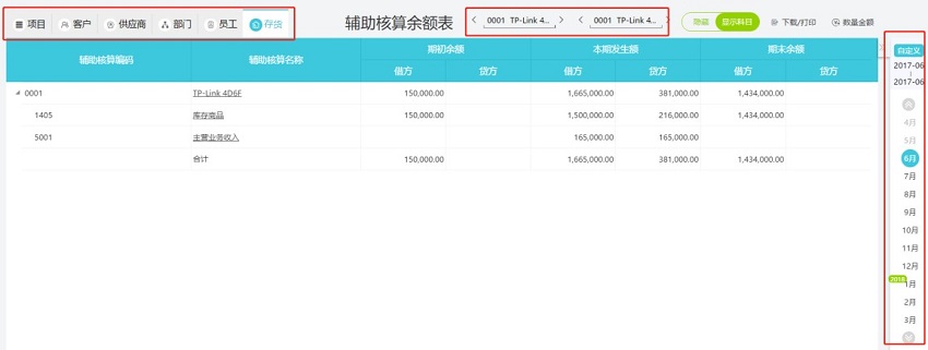 “辅助核算余额表”标题后的项目名称选择,可单选某个项目名称,也可以区间选择某 2 个类别名称,统计这个区间的余额。