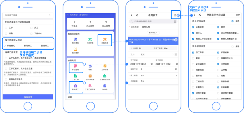 针对只需要简单填写完工数量和时间的报工场景,支持极简报工模式,便于不熟悉系统的用户简单完成工序报工。
