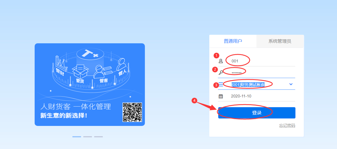 打开T+软件,依次输入用户名、密码并选择账套,下面的日期是操作日期,我们正常做几月份的账,就以几月份的日期登录进去,就算账号没有密码,也要点一下密码的输入框,最后点登录,进入系统